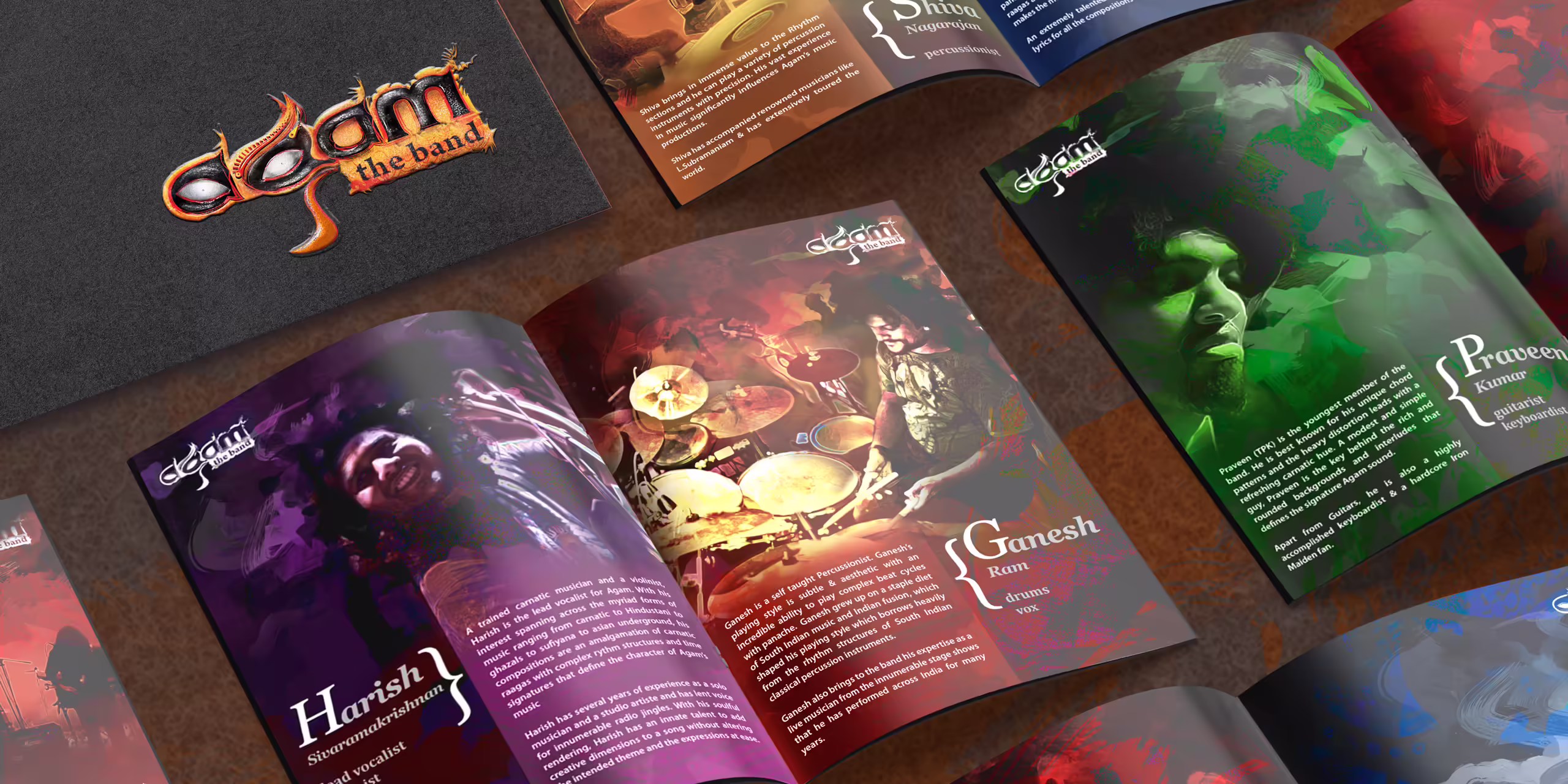We created a cohesive visual identity for Agam, a Carnatic Rock band, by designing a logo, stage backdrop, and brochure that reflect the band's unique fusion of traditional Carnatic music and contemporary rock.